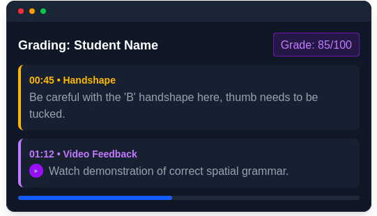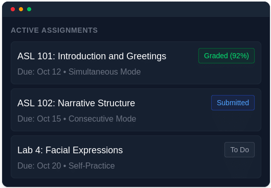 GoASL is a comprehensive digital platform designed specifically for university ASL instruction. It solves the core challenge of teaching ASL: enabling students to practice visual communication skills in a recorded, repeatable format while giving instructors powerful tools to assess, provide feedback, and make peer reviews easy.